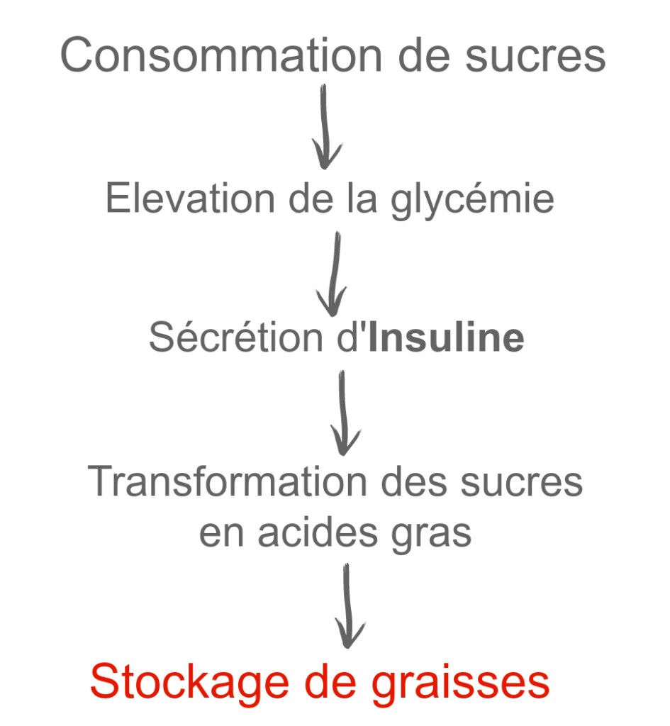 ♦ Plus je sécrète d’insuline, et plus je stocke dans mes cellules (surtout si elles ne dépensent pas tout ce glucose en énergie…).  Si de plus j’ai du glucose en excès, les cellules le convertissent en gras en créant une cellule graisseuse, une adipocyte.