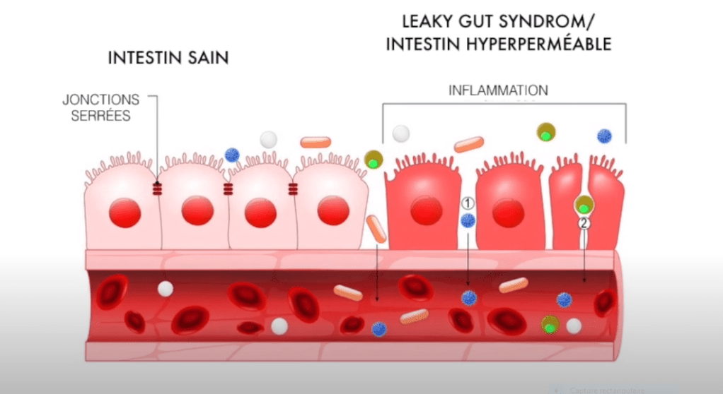 Tous ces aliments mal digérés arrivent au niveau de notre barrière intestinale (qui absorbent les nutriments et les distribuent à nos cellules) : cela déclenche une inflammation et RONGE les cellules de l’intestin qui au lieu de ressembler à un filtre parfait et bien serré (pour ne pas laisser passer n’importe quoi) commencent à s’écarter : c’est ce que l’on appelle une barrière poreuse…