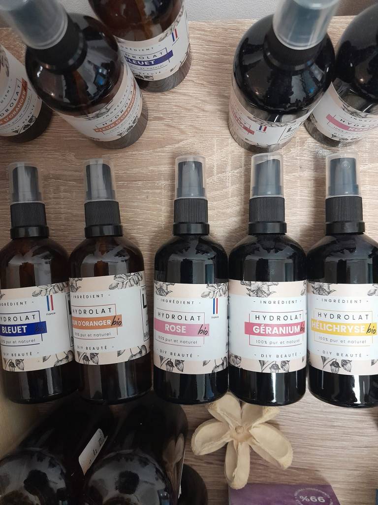 2 : Hydrolats bouteilles en verres : Bleuet, rose, géranium, hélichryse, fleur d’oranger