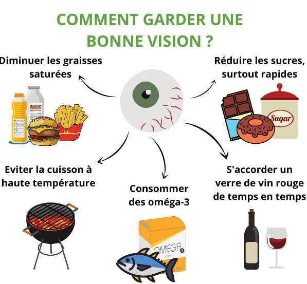1 / Diminuer la consommation de graisses saturées : la consommation de graisses saturées peut avoir de graves conséquences sur la vision. Pour les éviter, éliminez de votre régime les viandes grasses, les laitages gras et les aliments industriels.