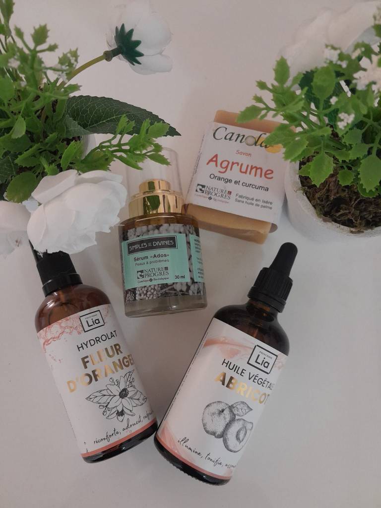 3 Produits bio certifiés Nature et Progrès,t Cosmos, Ecocert 1 hydrolat fleur d’oranger 100 ML 1 sérum ado 30 ML mais pas que ! adapté à toutes problématiques de peau de part sa composition 1 huile végétale d’abricot 100 ML 3 produits + 1 savon bio en cadeau ! Frais de port compris
