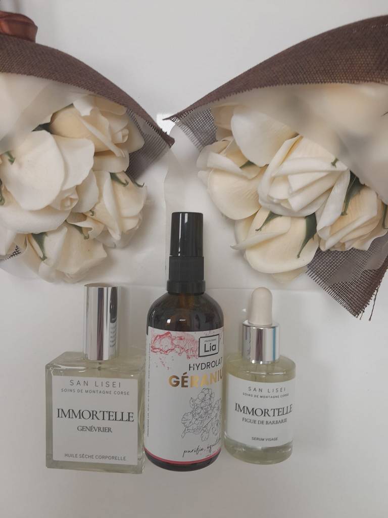 Spécial offre promotionnelle 3 Produits certifiés naturels sans perturbateurs endocriniens ! 1 huile sèche d’ immortelle et genévrier 1 hydrolat de géranium 1 sérum d’immortelle et de figue de Barbarie 1 savon certifié bio en cadeau! 3 produits+ 1 Cadeau et frais de port compris Tous les produits détaillés ci-dessus.