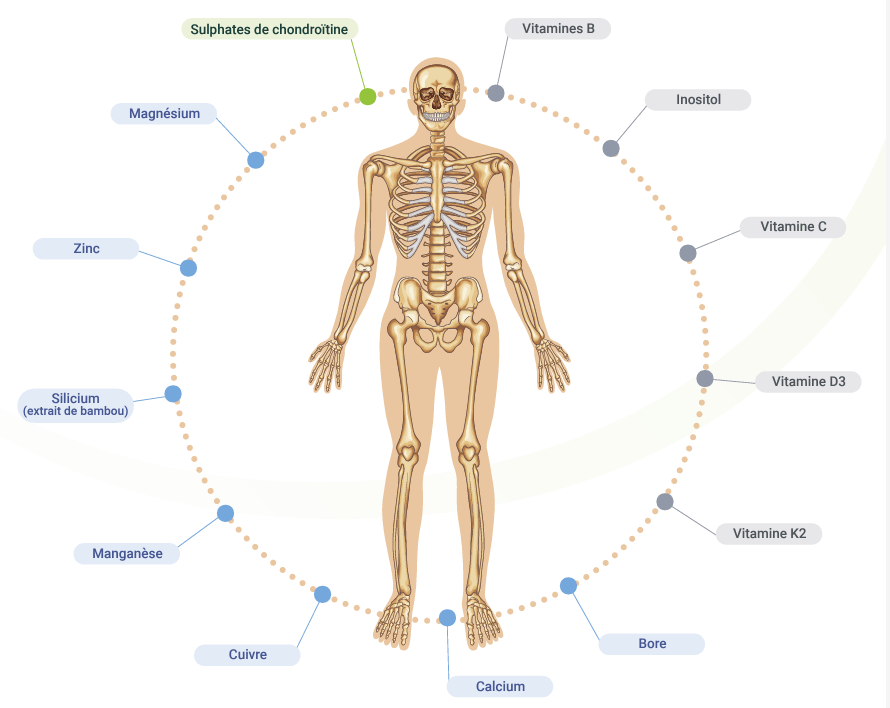 Le magnésium a différentes fonctions relatives aux os. Ainsi, il régule l’homéostasie du calcium, ce qui signifie qu’il favorise l’accumulation du calcium dans les tissus osseux et empêche le dépôt de calcium dans les tissus mous. En outre, le magnésium favorise la formation des os par l’activation de la phosphatase alcaline et de l’hormone parathyroïdienne. Le magnésium est également nécessaire à l’activation de la vitamine D. Il s’accumule en outre dans le tissu osseux, où il assure principalement la flexibilité. Compte tenu de cette fonction multiple et du fait que l’alimentation occidentale est carencée en magnésium, les besoins en magnésium sont importants. Les besoins quotidiens en magnésium sont bien supérieurs à ce que peut apporter un multi-supplément. C’est pourquoi une supplémentation en magnésium est recommandée en plus d’un bon « multi-supplément pour les os ».