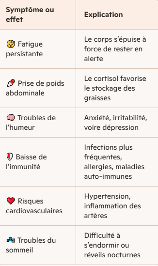 Quand on est stressé, le corps libère des hormones comme le cortisol et l’adrénaline. Ces hormones sont utiles à court terme (réaction de survie), mais en cas de stress chronique, elles perturbent le fonctionnement du système immunitaire :