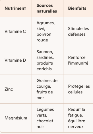 Focus sur les nutriments clés : vitamine C (agrumes, kiwi), D (poissons gras), zinc (graines, fruits de mer), magnésium (légumes verts, chocolat noir)