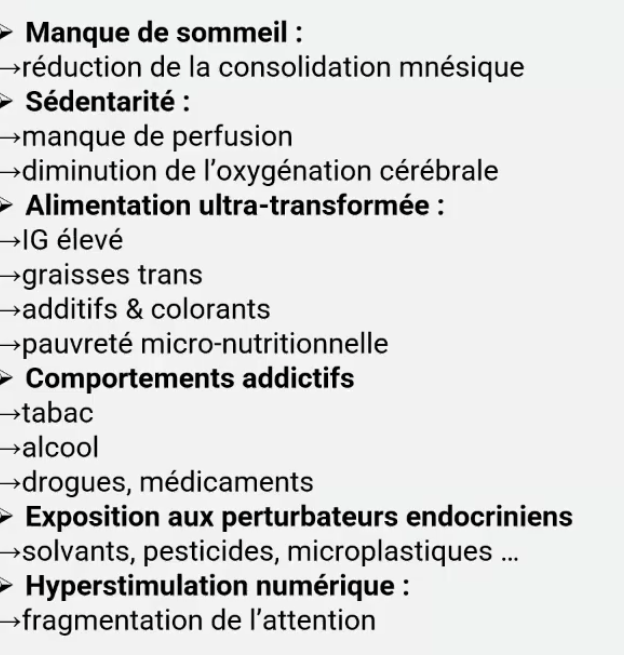 - Stress chronique : le cortisol, hormone du stress, altère la mémoire et réduit la capacité d’attention.